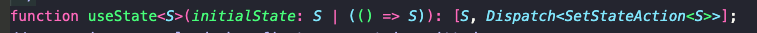 - useState는 S라는 제네릭 타입을 받고 있고, 파라미터로 S의 타입을 가지고 있는 값을 받습니다. 혹은 함수형태로 S타입의 값을 할당할 수 있습니다.